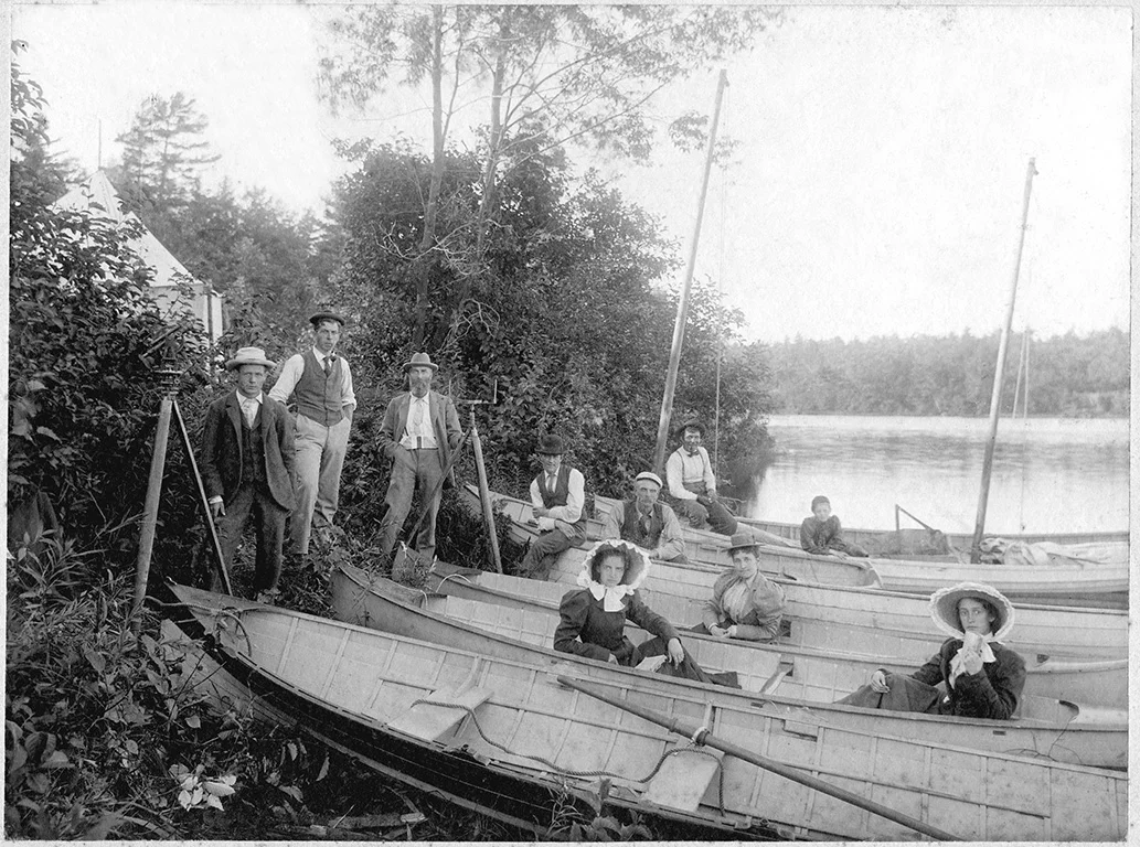 Bill Sing was a dynamo of entrepreneurial energy. The survey crews (above) that he worked with included axe men and cooks. He took clients – and pretty ladies – out for island tours in his sailboat. He was also given to holding chapel services at his cottage, Nugamo (far left). If the faithful also happened to be prospective buyers of Pointe au Baril real estate, so much the better.
