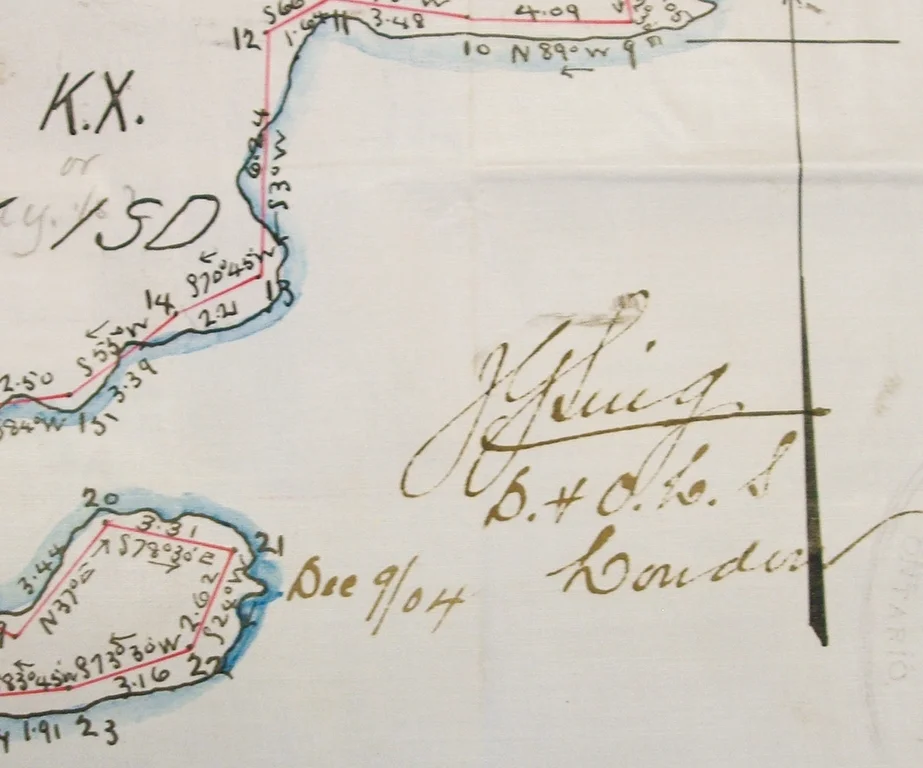 “Gobble and plunder in Georgian Bay” was the headline of a Parry Sound North Star article in 1910. The selling of crown land by the government was to encourage settlement, not speculation, but this story described an elaborate scheme by which land was being sold to a number of “straw men” – “usually an illiterate working man in the vicinity” – in order to resell the islands, at a tidy profit, to legitimate purchasers. Sing’s name was not mentioned in the article, but it was during this period that he embarked on his “biggest coup in the real-estate line.” Sing sold “parcels” of Pointe au Baril land to Canada’s then-Governor General, Earl Grey, and to several of his friends in England – Lady Beatrice Herbert, Lord Desborough and the Duchess of Portland among them. These properties were never occupied and, in most cases, never even seen by their English owners. The land was bought purely as an investment – one that did not work out as well as the purchasers must have hoped. Some years later, when the biggest piece was sold for default on taxes, it was picked up, at an extremely attractive price – by one William H. Sing.